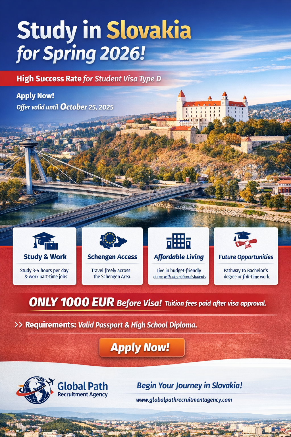 Global Path Recruitment Agency is pleased to announce an exciting study opportunity in Slovakia for the Spring Semester 2026, offering a high visa success rate under Student Visa Type D. This is a limited-time offer valid until 25 October 2026, so early action is highly encouraged.